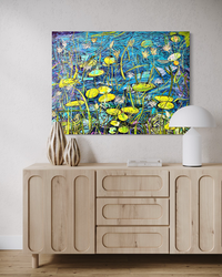 his is my newest work, and I'm quite happy with its results. The transformation surprised me. I thought I would get away from lilies and started laying down blues that seemed to flow like water, then greens that turned into stems, and then flowers appeared. Every time I stepped back and looked at my work, as I like to do, I was amazed by the transformation. Love this and hope it brings a sense of calm to your day. Enjoy!!