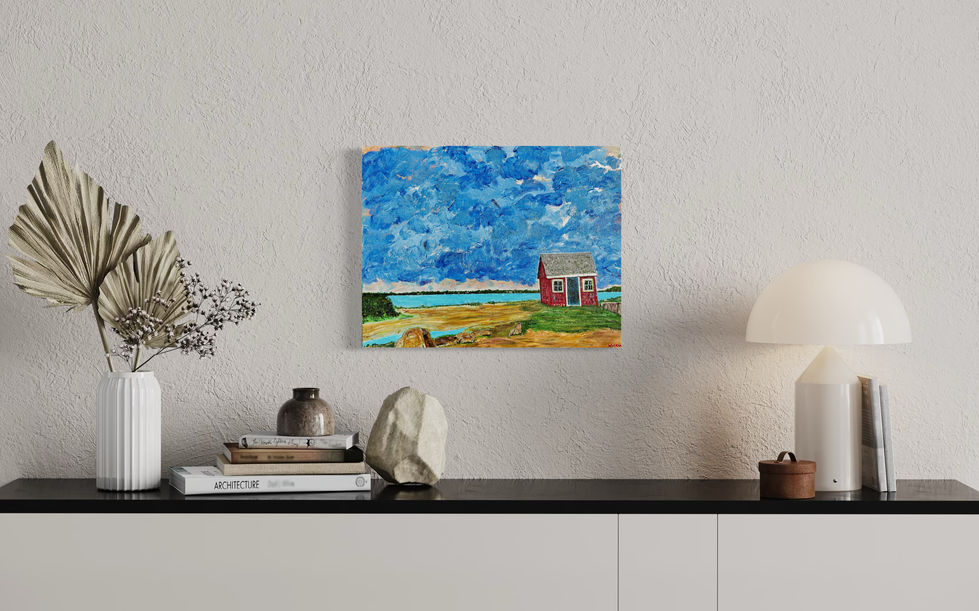 Years ago, I traveled through Nova Scotia and quickly snapped this picture as the weather changed. The blue sky and water set against the red house inspired me to paint this beautiful scene. The sides of this work are finished. The painting is wired and ready for hanging.
